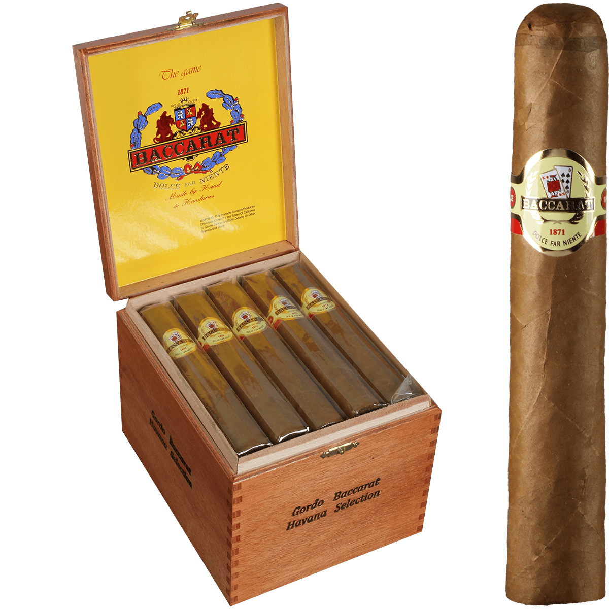 The Baccarat Gordo is the big-format expression of one of the most consistently popular mild cigars on the market — hand-rolled in Honduras under the Davidoff umbrella with a Connecticut Shade wrapper, Mexican San Andres binder, and Cuban-seed Honduran long-filler that's been keeping fans coming back since the late 1970s. At 6×60, it's built for the smoke that doesn't need to be rushed.