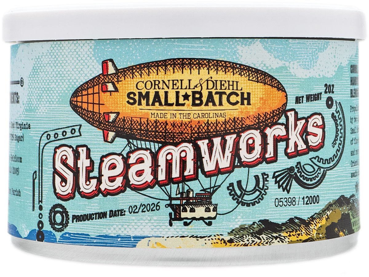 • Available March 3, 2026. Steamworks is a complex Virginia/Oriental flake comprising a range of top-tier tobaccos — including six unique, matured Old Belt Virginia grades, genuine St. James Perique, and heirloom Black Sea Sokhoum Orientals from 2005 — enh